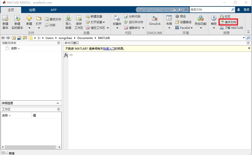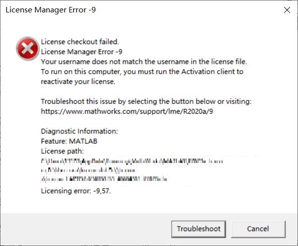 (注意:安装和使用MATLAB时Windows系统用户名必须一致,否则启动MATLAB时会报如下错误)